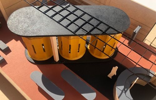 The space was created using a grid system, drawing inspiration from the dynamic arrangement of a DJ controller to inform the placement and design of objects.